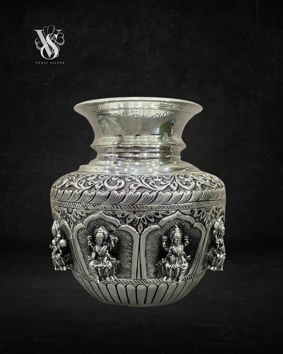 In Vedic rituals, the kalasam represents the cosmic source of creation and is believed to attract and hold positive vibrations, wealth, and spiritual grace. Placing a silver kalasam on your altar or pooja setup enhances the sanctity of the space and invokes blessings of prosperity and peace.