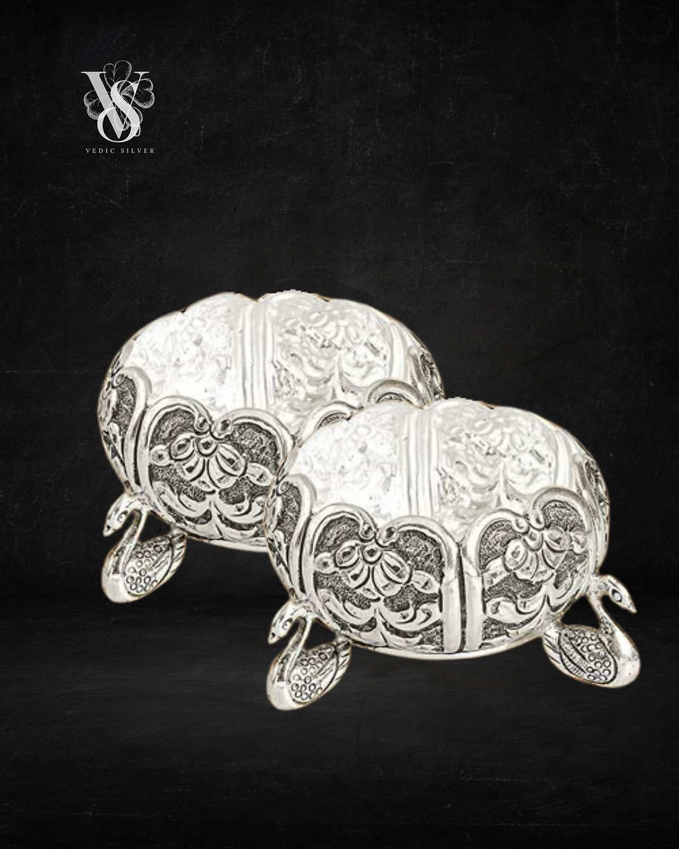 Our silver kumkum and gandham bowls are designed to bring elegance and purity to your most cherished traditions. Used in daily worship, festive rituals, and auspicious ceremonies, these bowls are both functional and deeply symbolic - representing respect, devotion, and divine offering.